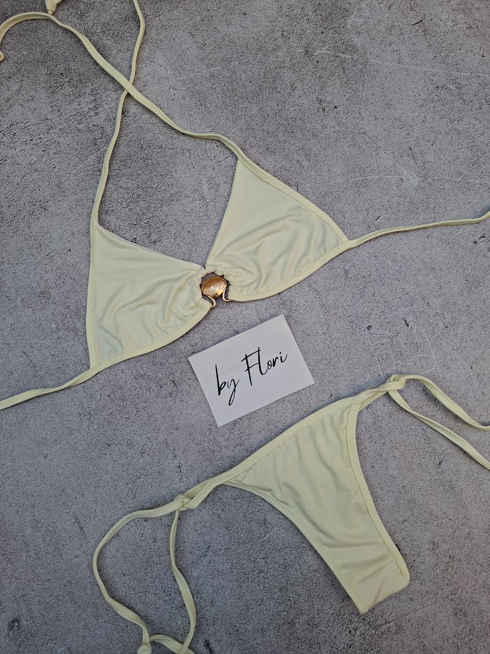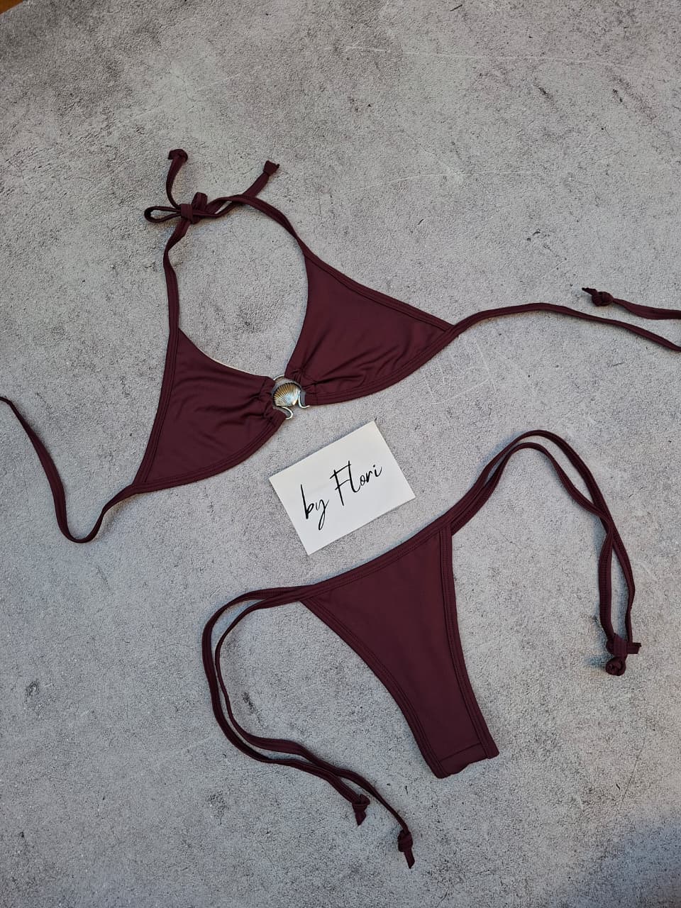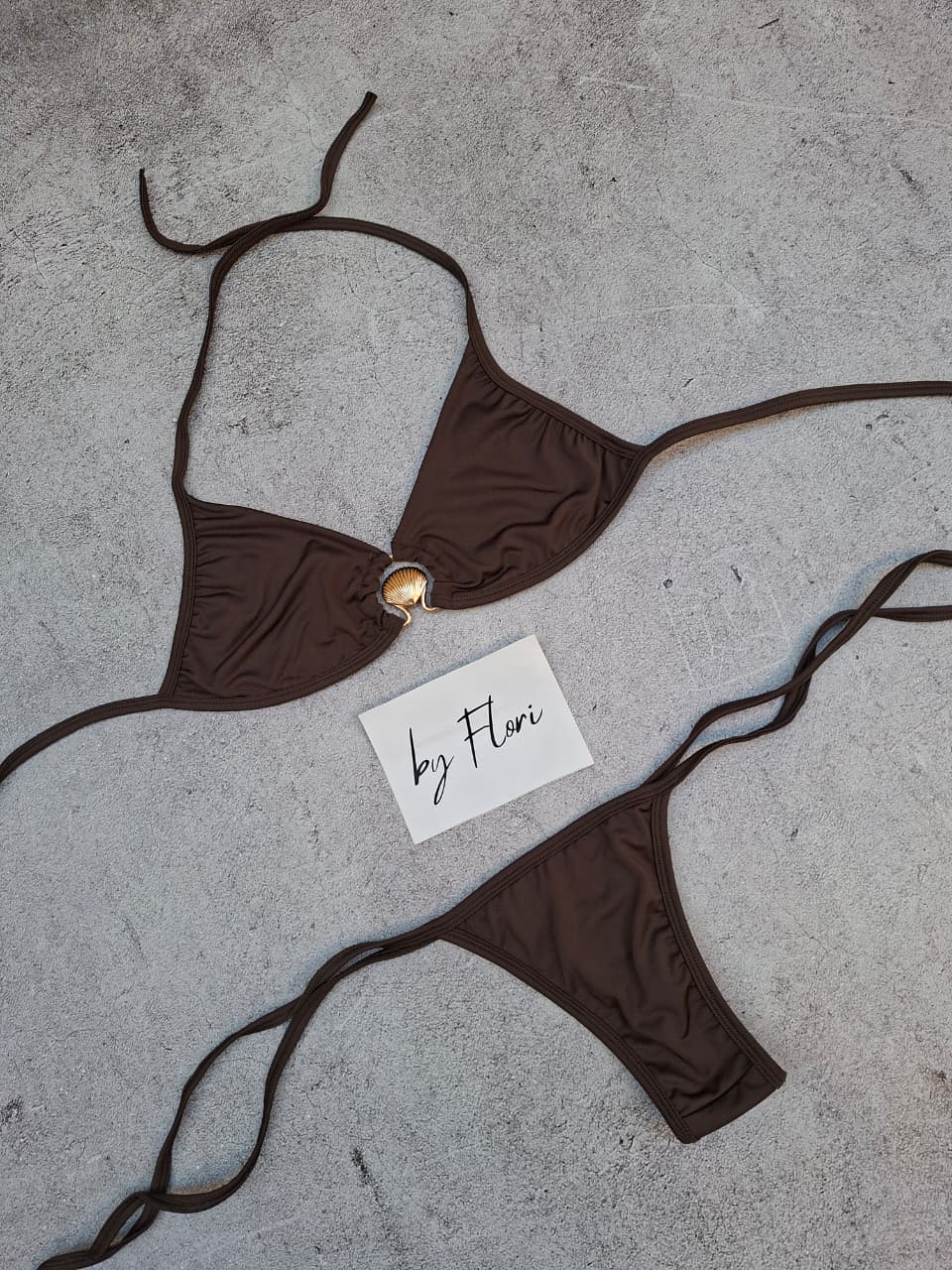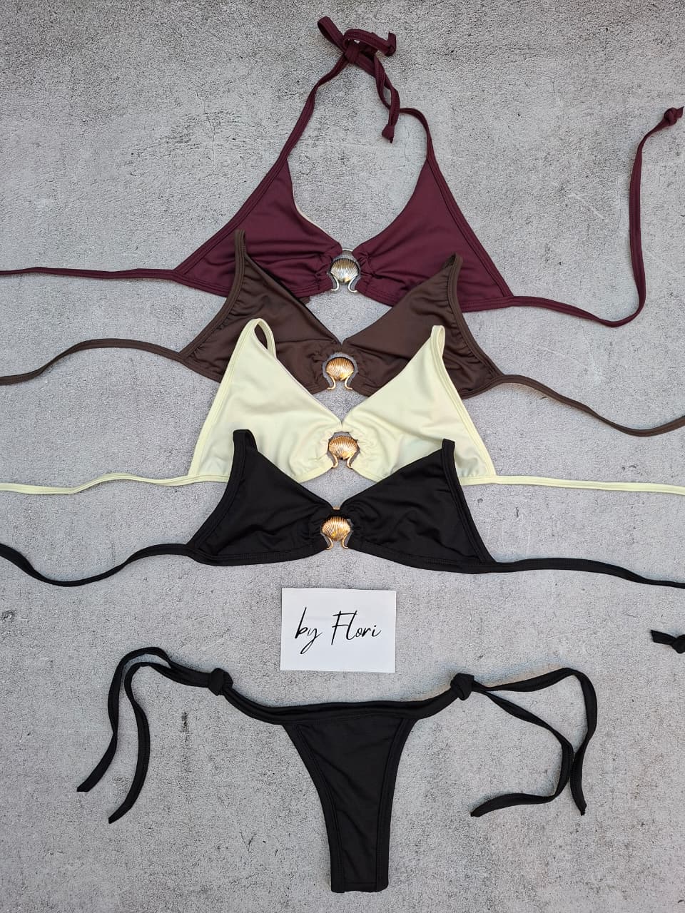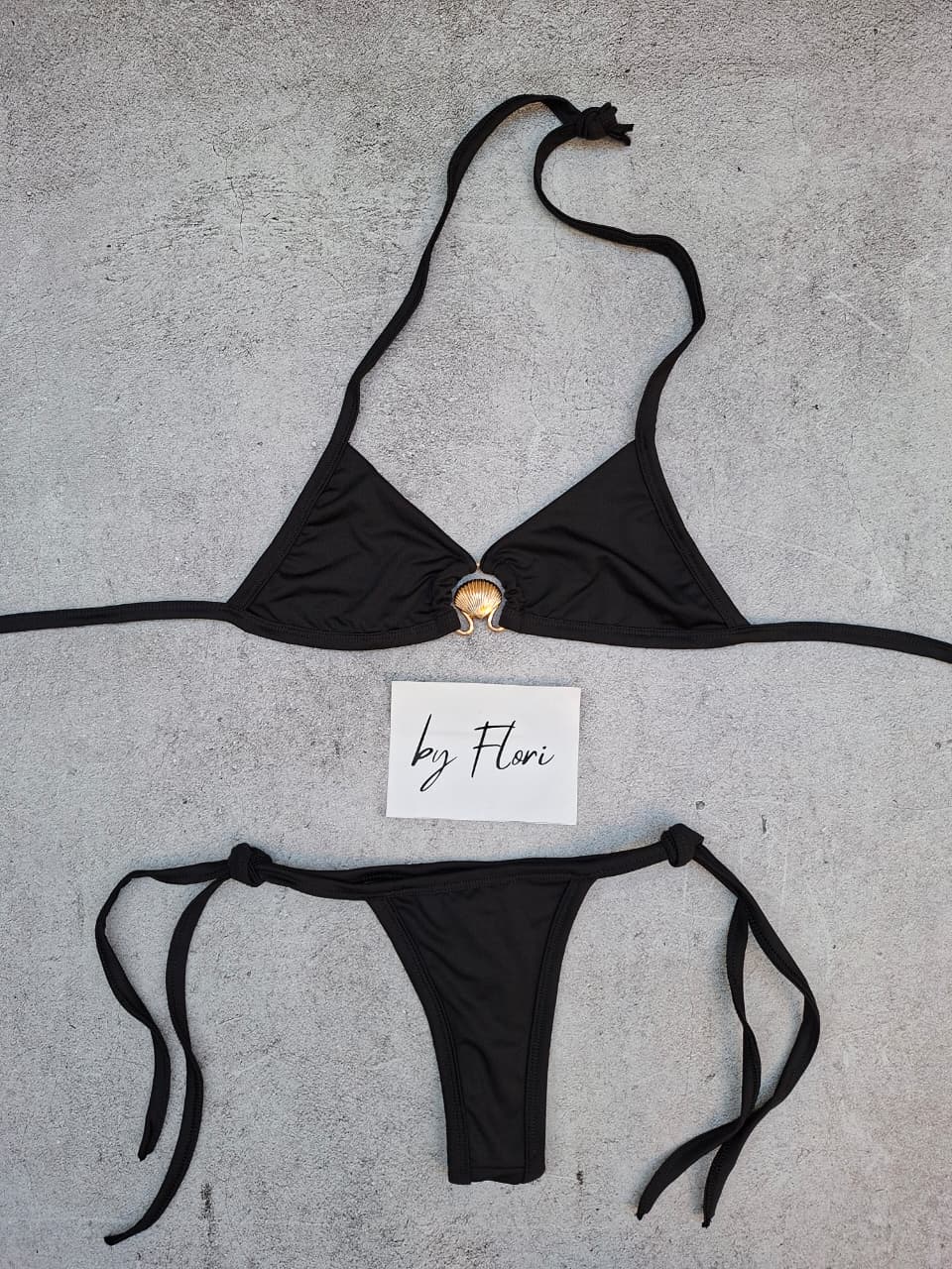 Bikini triángulo en lycra pesada, súper cómoda y con tiras corredizas para que la ajustes como quieras. El top tiene un detalle de estrella metálica importada que le da un toque único y sofisticado. La bombi es colaless, con tiras finas.